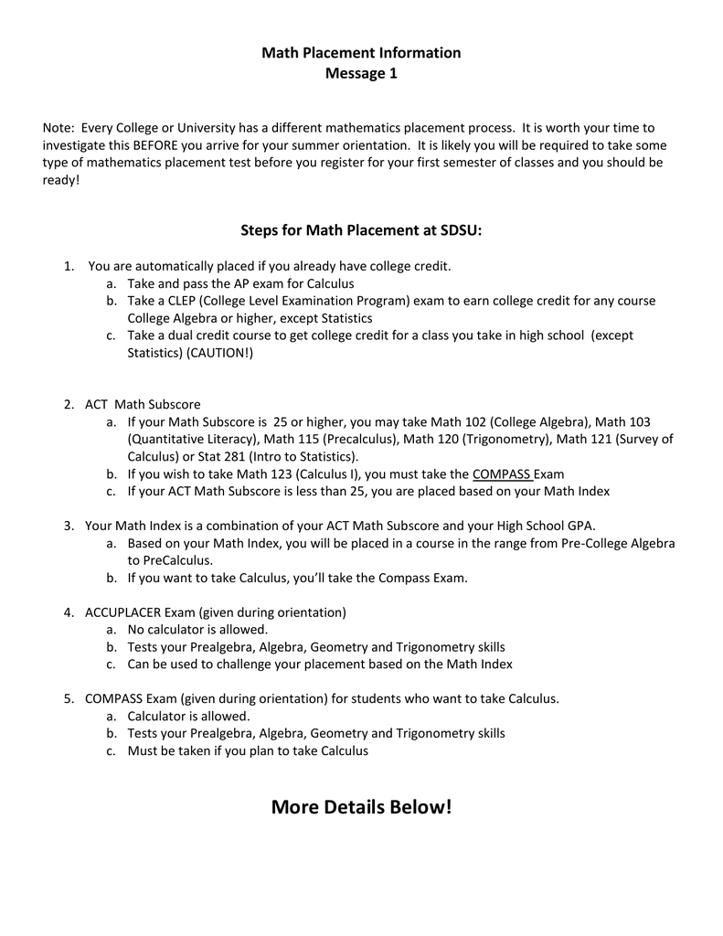 Therefore placing into the appropriate college-level math course will save you time and tuition. 18 440 Critical Reading.