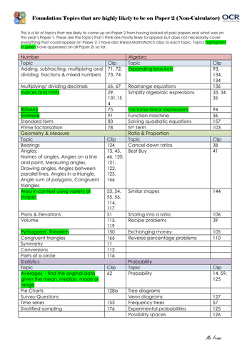 Ocr Paper 2 5 Non Calculator 2018 Revision List For Year 11 Teaching Resources